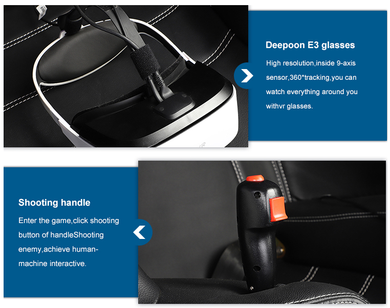 9D virtual reality simulator perfect combination of virtual reality equipment, hardware peripherals and entertainment platform, to change the traditional form of entertainment and variations created to allow consumers to enter the interactive entertainment industry. Players can sit in every seat eggs and glasses VR. They can feel the left, right, front, according to various scenes in the game, after, and move back and forth.